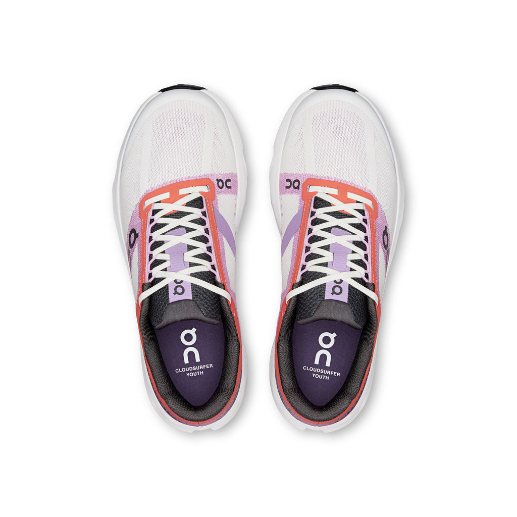 Meet the On™ Kids Cloudsurfer Youth, engineered to keep up with nonstop movement and growing feet. Designed after carefully analyzing how big kids run, these shoes feature an adapted CloudTec Phase™ system that works seamlessly with their anatomy and natural gait. The lightweight Helion™ superfoam midsole delivers smooth, effortless transitions while absorbing heel impact for cushioned, confident strides. A breathable polyester upper and lining keep feet feeling fresh, while the Ethylene Vinyl Acetate insole adds soft underfoot comfort from morning play to after-school adventures. The durable rubber outsole extends over the toe box with added channels and grooves, enhancing flexibility, grip, and range of motion for running, jumping, and quick turns. A protective TPU toe cap shields little toes from everyday bumps, and the secure lace-up closure ensures a snug, supportive fit.